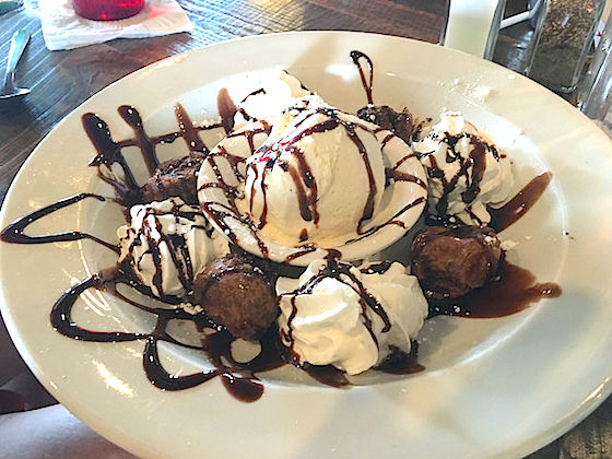 The chicken tenders with fries, jicama slaw, and some kind of house made, fantastic honey mustard dipping sauce were among the best we have ever tasted (second only to the long gone Flying Chicken Tenders Platter Houston's Restaurant used to offer). And for dessert we shared perhaps the finest creation of all time: cookie dough that was battered, fried, topped with vanilla ice cream, and drizzled with chocolate sauce. Oh my goodness – these fried cookie dough balls were so gooey and delicious that we almost ordered a second plate despite being so stuffed with food they needed a wheel barrow to get us back to the family truckster.