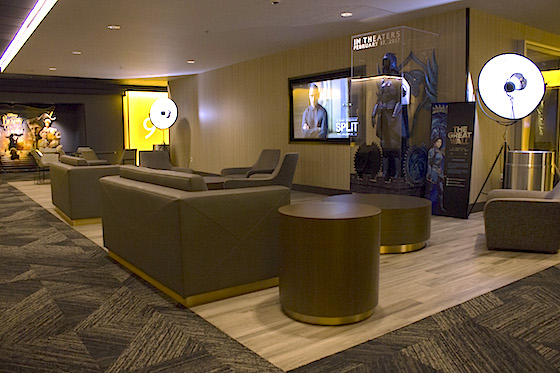 At the CityWalk theaters, Universal instead provides open, comfortable seating lounges for patrons to wait for their show. Universal's also brought in costumes and props from current films for display, but instead leaving them in the lobby, they are placed throughout the lounges, further helping to encourage the crowd to spread around the facility.