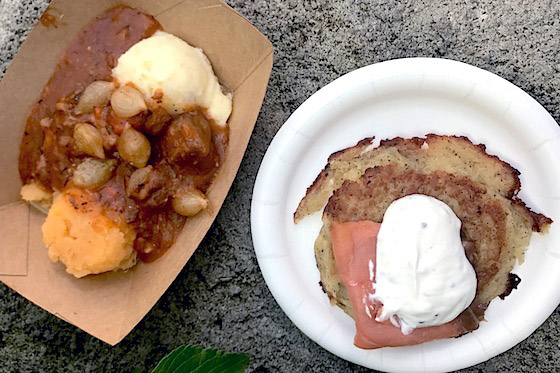 Available at the Wee Scottish booth this year is a Traditional lamb stew, a potato pancake with Salmon, and a Tipsy Laird cake (whiskey soaked cake). We decided to have the two savoury dishes.