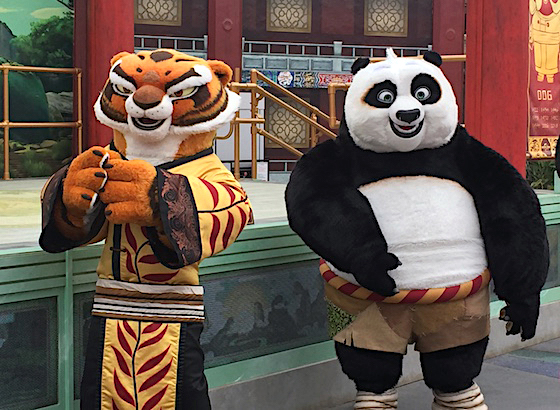 The biggest crowd in the land was gathered around the star of Kung Fu Panda, Po, who greets fans along wth Tigress throughout the day. Every hour, Po and several human King Fu assistants take the stage for a "Jedi Academy"-type training show, where they pull a few children from the audience to learn Kung Fu poses on stage.