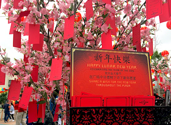 Banners around the plaza celebrate each of the astrological signs that denote each new year. (This is the year of the dog, ICYDK.) Blossoming cherry trees fill the middle of the plaza, with red slips for you to write a wish and hang from a branch, in a Lunar New Year tradition.