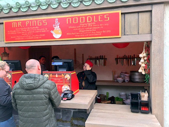 The land includes three Kung Fu Panda-themed attractions. Let's start with Mr. Ping's Noodle Shop, which is a character meet-and-greet and pop-up restaurant.