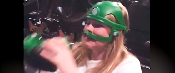Sounds like a plotline similar to Batman: THe Ride as it existed in WB Movie World Australia, which was a motion simulator.