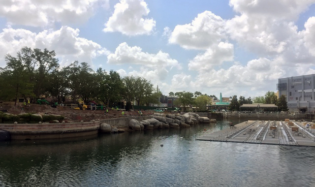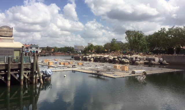 You can see the scope of the project from pretty much anywhere else around Universal Studios Florida's lagoon. Universal has dropped the water level in the lagoon for the construction, exposing the show effects deck that will provide the "stage" for the production.