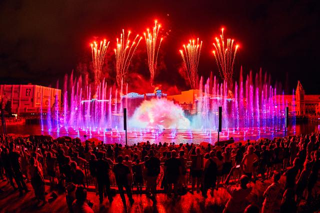 Dubbed "Universe of Color" by the more sarcastic among us in the theme park fan community (hey, why is everyone looking at me now?), Universal's new show certainly fits the mold popularly established by the Disney California Adventure production. Water screens? Check. Pyro? Yup. Rousing, popular movie songs? Uh huh. Clips from beloved films? Gotcha. No over-arching theme or narration to distract us from those clips?