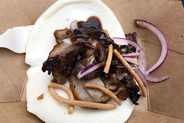 China — Beijing Roasted Duck Bao with Hoisin Sauce ($6.75) Bao buns are one of my favorite glutenous products. That sweet, warm white bread goes so well with almost anything. Place some shredded duck along with some hoisin sauce, red onion and crunchy noodles to make any already perfect piece of bread even more amazing.