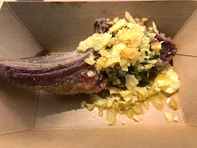 Australia — Grilled Lamb Chop with Mint Pesto and Potato Crunchies (Gluten Free, $7.75) The lamb chop is back! Last year, it was a thin salty piece of lamb "T-bone" that was plain bad, but this year the lamb chop has returned to all its glory. The lamb chop is grilled, topped with mint pesto (but not too minty), and topped off with the potato chip pieces that you find at the end of your chip bag. I'm so happy it's back. *If you have a Disney Dining plan, make sure you use the snack credits on the more expensive dishes like this one. Snack credits can be used on F&W items, but you get the best deals on the higher-priced items.
