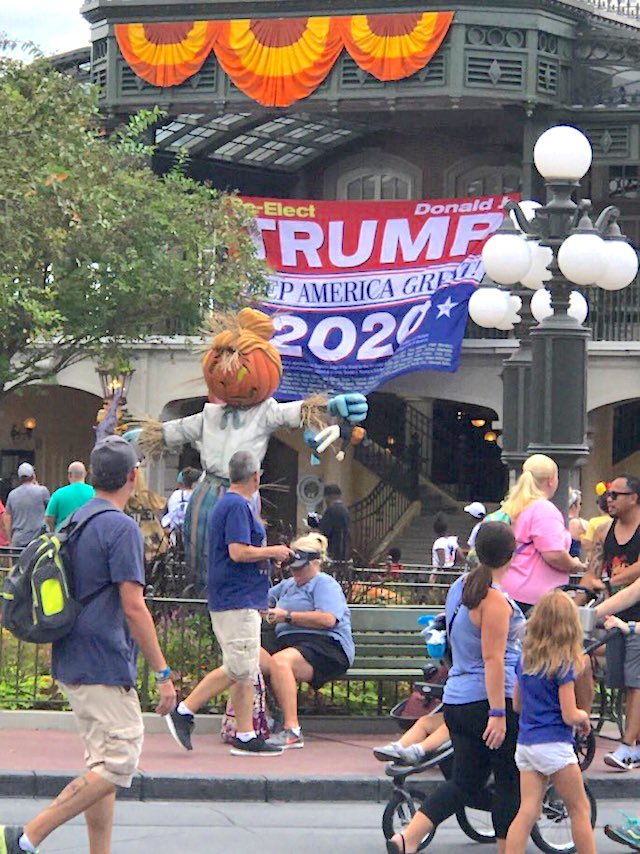 Twitter user disneyjail this afternoon posted a photo from Walt Disney World's Magic Kingdom of a large "Re-Elect Trump" banner that someone apparently had hung from the upper floor of the Main Street train station.