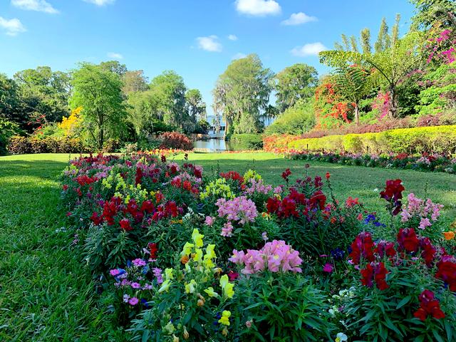Flowers lead the way down to Lake Eloise, upon whose shores Cypress Gardens was built.
