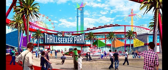 As for the Thrillseeker design, Six Flags' email about the plan says that "three distinct themed areas are included in the master plan. Two areas are fully themed to Six Flags global brand standards while the third is dedicated for local customization. Thinking ahead, the park is designed with an additional expansion zone that can be a future Water Park, Adventure Park, or Kidz Park."