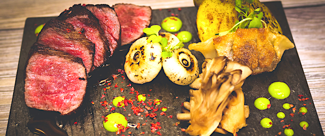 Entrées include exquisite dishes like Kamo Rosu and Takumi Gyuniku. The Kamo Rosu features roasted marinated duck with kabocha squash, edamame beans, Japanese mizuna, cured duck egg yolk, and a grape reduction. The Takumi Gyuniku, or artisan beef, shines the spotlight on a Japanese A-5 wagyu beef tenderloin with leek sauce, warishita, short rib gyoza, roast cippolini onion, curried potato, and seasonal mushroom.