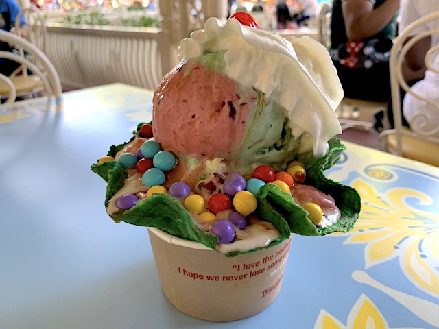 In addition to the parade-themed krispie treat, marshmallow "caterpillar" wand, and cake pops, Fantasia ice cream has returned to the Gibson Girl Ice Cream Parlor for the parade's run. A modified spumoni of cherry, pistachio, and banana ice creams, my serving came in the Fantasia Waffle Bowl Sundae [$7.99], which comes with caramel sauce, chocolate candies, whipped cream, and a cherry.