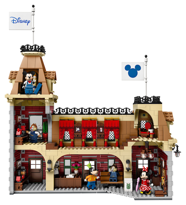 This US$329.99, 2,925-piece "LEGO Disney 71044 Train and Station" set also includes a three-story, 15-inch-tall model of the Main Street station, including a ticket counter, cafe corner, and a tower room, all featuring brick-built furnishings and details such as draped windows, a wall clock, and a ceiling chandelier.
