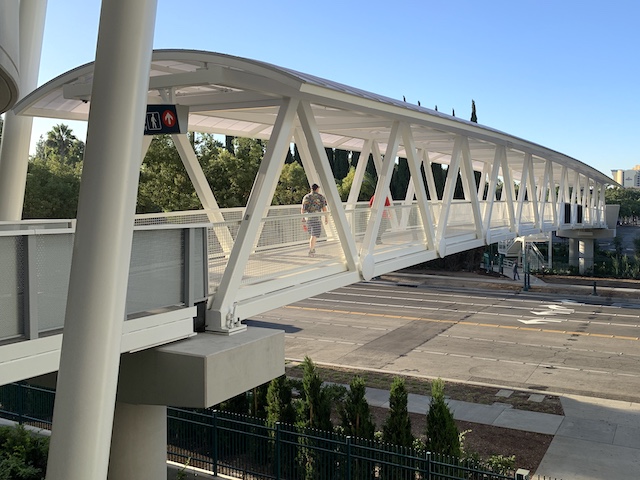 The new bridge over Magic Way connects the second floor of the new Pixar Pals parking structure with the sidewalk along the western edge of the Downtown Disney parking lot. Visitors will enter the resort's secure zone through the existing screening next to the old ESPN Zone. The overpass allows visitors to skip the traffic signals while crossing Magic Way or Disneyland Drive, as they used to have to wait for when taking any of the various versions of the walking path between the garage and the parks.