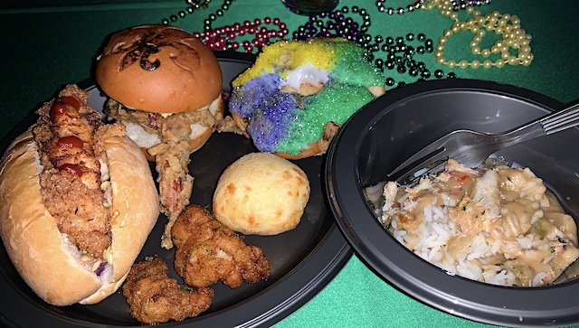Yesterday, we talked about Universal's new Mardi Gras menu this year, so I was looking forward to getting to taste the food. Universal set up a buffet, and I started with a catfish po’ boy, softshell crab slider, Pao de Quiejo, gator bites, crab étouffée, and king cake.