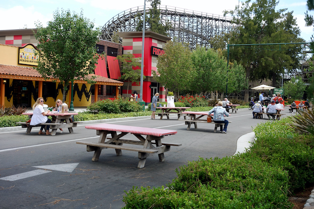 A great surprise was the addition of picnic tables in the road that runs through the Marketplace. A few were in the shade, others had umbrellas. Knott’s staff would swoop in between parties to clean the tables as much from spilled gravy and pie crumbs as possible contamination from Covid-19.