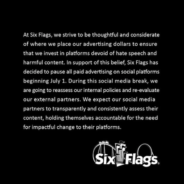 Six Flags has joined the growing list of companies that have pulled their advertising from Facebook, as well as other social media platforms, in protest over those platforms' promotion of lies and hate speech.