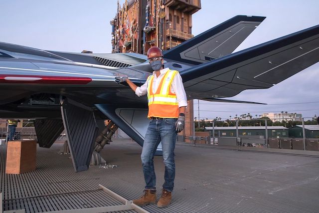 Here is new Disney Parks Chairman Josh D'Amaro with the Avengers Quinjet that's just been installed atop the new land.