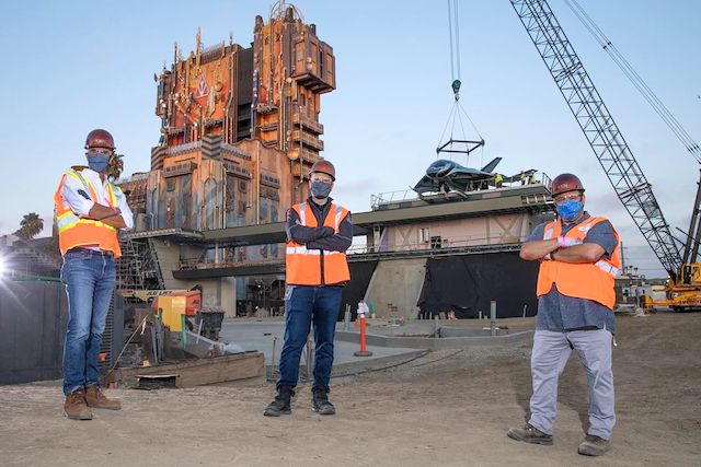 Here's the Walt Disney Imagineering project crew posing with the Quinjet, overlooking the Avengers Campus site.