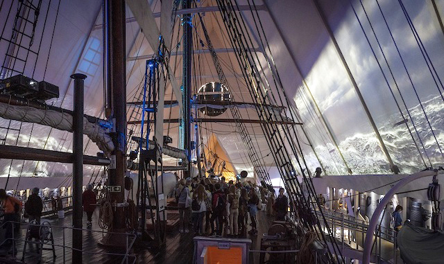 For years, the Fram was housed in a relatively simple structure. But the museum's renovation brought the ship to life by surrounding it with a 270-degree video screen that shows polar scenes on a 15-minute loop, creating the illusion that the ship is at sea. Localized audio and even a rocking bench on the deck help complete the illusion.