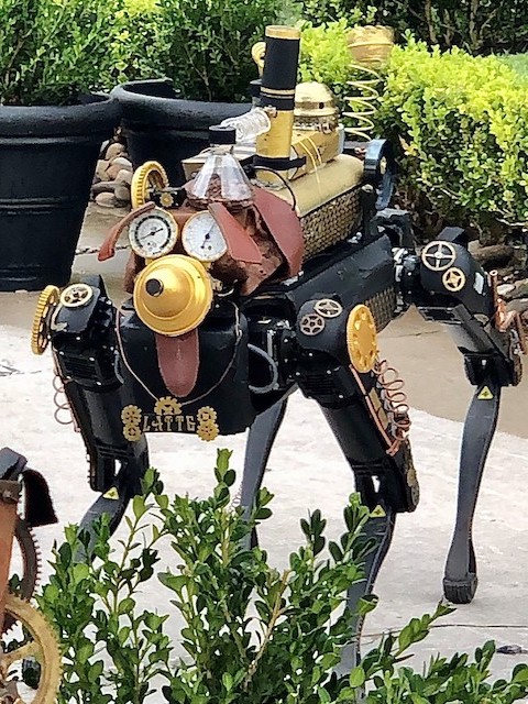 According to Universal's new backstory, Penelope and Jacques built Latte with "leftover cogs, wheels and kitchen utensils," to create a "woman's best friend" that keeps with the steampunk esthetic at CityWalk's Toothsome Chocolate Emporium & Savory Feast Kitchen. IRL though, Latte is a dynamic Spot robot, using tech developed by Boston Dynamics.