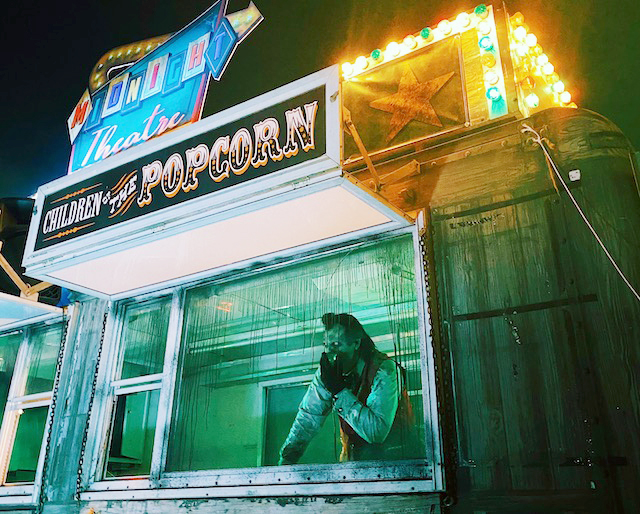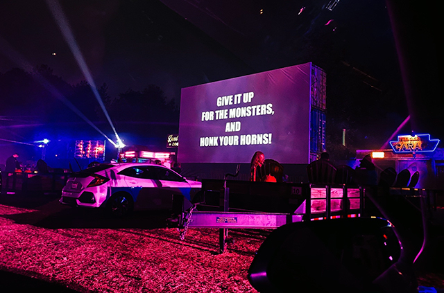At the end of the road, we were ushered into a clearing, then into a parking spot in front of a 40-foot screen. The theme for this year’s “hayride” is a drive-in movie set in the fictional town of “Midnight Falls,” which was the setting of last year’s hayride. The scene looked like a classic drive-in movie setup revamped to enable a multimedia storytelling experience with themed sets and a few small stages. Traffic direction was definitely hectic and disorganized, but considering the entirely re-invented structure demanded by COVID, this was understandable. As the show began we tuned into the designated radio station and an announcer with a Vincent Price-style voice let everyone know that if they needed to use the restrooms “please wait until after the lights have turned off.” By this time actors in scary outfits had begun to enter the area donning creepy masks and brandishing chainsaws, so we figured going to the bathroom was going to be an absolute no-go.