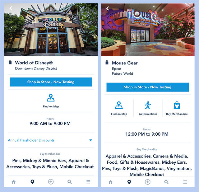 You can find the new feature under the listings for World of Disney in Disneyland's Downtown Disney shopping district and Mouse Gear at Walt Disney World's Epcot on the official My Disney Experience app for Walt Disney World and the Disneyland app on the west coast. Just click the big "Shop in Store — Now Testing" button to begin.