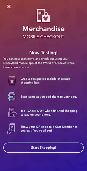 That will bring up a screen that explains the four-step, in-store shopping process. Please note that while you can access this feature on the apps when you are outside the parks, this is not for shopping at home. It's just for paying for items in the store without having to queue for a register. If you want to shop for Disney theme park gear at home, hit up ShopDisney.com as usual.