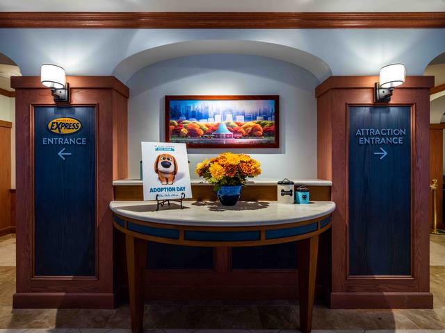 We got a walk through the new ride's queue just before the pandemic hit a year ago, and described that for you in An insider's tour of Universal's new Secret Life of Pets ride. Let's check out some of these photos from the queues and the ride, too. We start in the building's lobby, but this is where you want to bail if you wish to avoid spoilers.