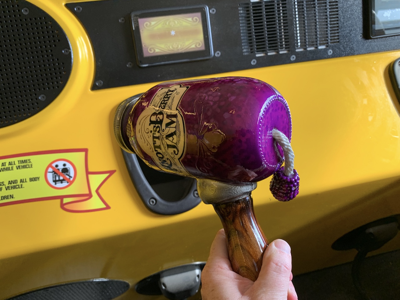 Yes, Knott's has added scent to this boysenberry-themed adventure, upon which you try to blast stolen pies from the clutches of Crafty Coyote's pups, who have been sent to raid the Boysenberry Pie Factory. Your shooter is a "jelly blaster," a jar of Knott's Boysenberry Jam with a boysenberry at the end of the pull string you will use to fire it. This makes the game play feel more like Disney's Toy Story Midway Mania than a traditional shooter with triggered guns. But it also means that gameplay here is a two-handed task.