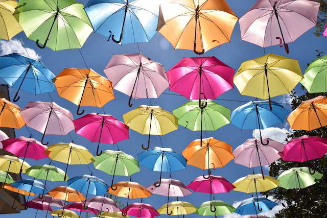 We were there just before the Flower and Food Festival opened, but it appeared that most of the remarkable topiaries were already in place, as was Umbrella Sky, a street completely shaded with open colorful umbrellas.
