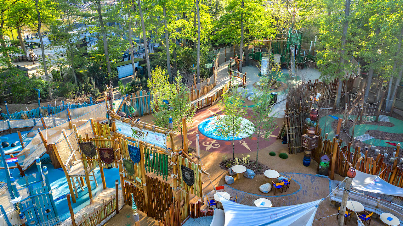 Elements in the Nest playforest in Efteling's Ruigrijk area are themed to several of the park's thrill rides. Not only that, it is designed to be accessible and welcoming to children with physical disabilities and neurodivergent children. The play area includes a dragon tower with a wheelchair-accessible slide, a large sea ship, waterbed, and an accessible wooden boardwalk.