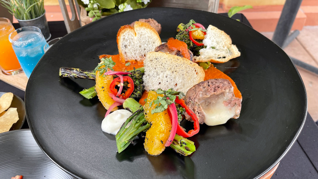 And the Mulholland Madness Meatballs, stuffed with cheese and served with spicy creamy tomato sauce, charred broccolini and orange segments, pickled red onions, whipped burrata, and crostini ($16).