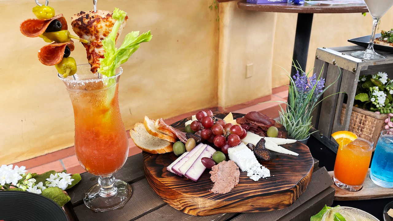 Almost all food and drink menu items lean into past locations names from Disney California Adventure. For example, here are the Pizza Oom Mow Wow! cocktail (Bloody Mary with Tito's handmade vodka and flavors of pineapple, pepperoncini, and mushroom - $17) and the Bountiful Valley Charcuterie ($18).