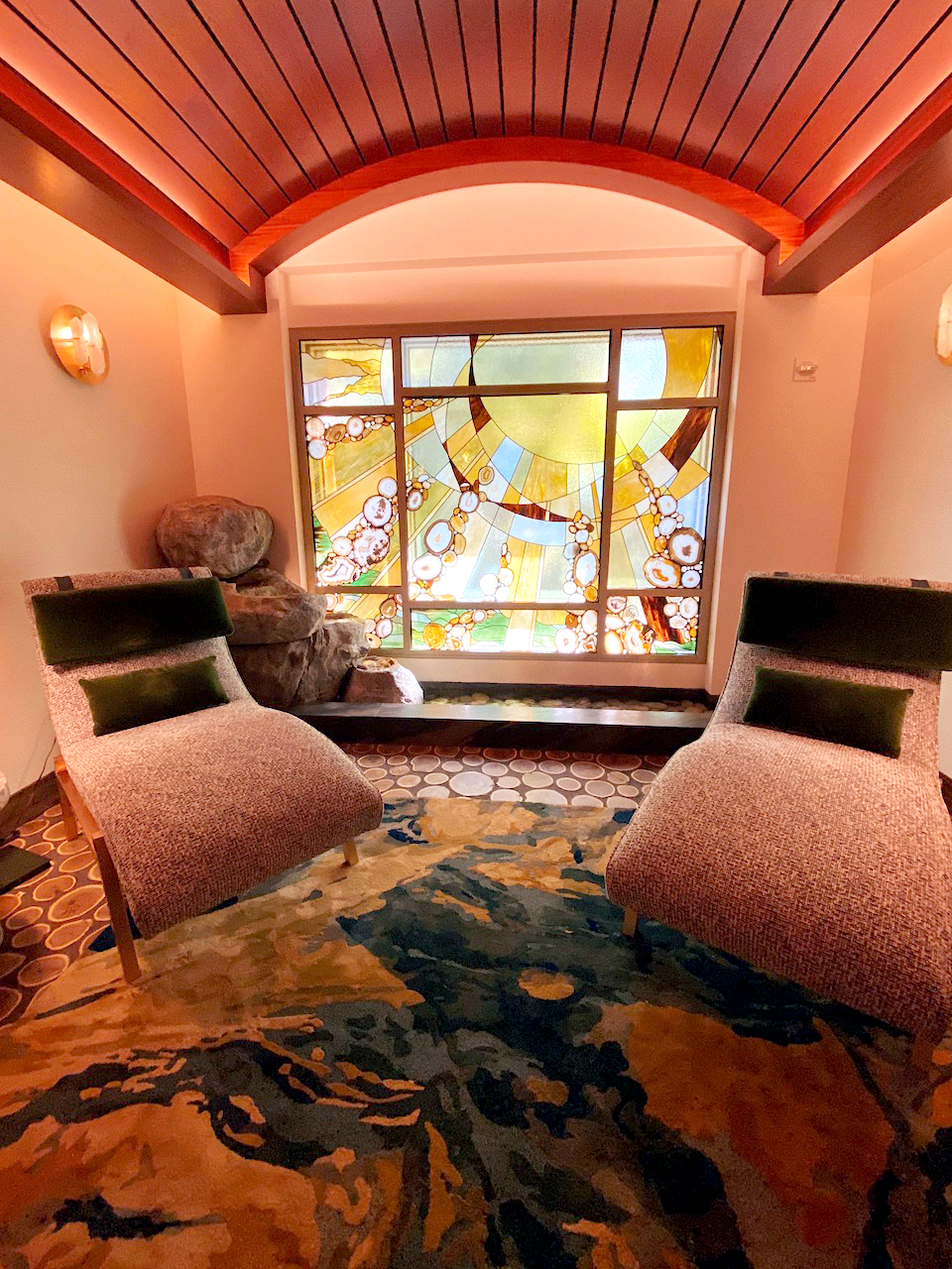 Visitors enter the spa area from the north, and directly across to the east lies a relaxation room, softly lit by an intricately designed stained glass window. Brass elements in the detailing evoke a warm gold tone that brings out the fire element the room is oriented around. The south side is oriented around the color red and the element of air. At the end of the south corridor hangs a formation of pumice stones, which can bring aeration to soil. The north side pays tribute to the element of earth and the color white. At the end of the north corridor is a detailed, white image inspired by indigenous basketry.