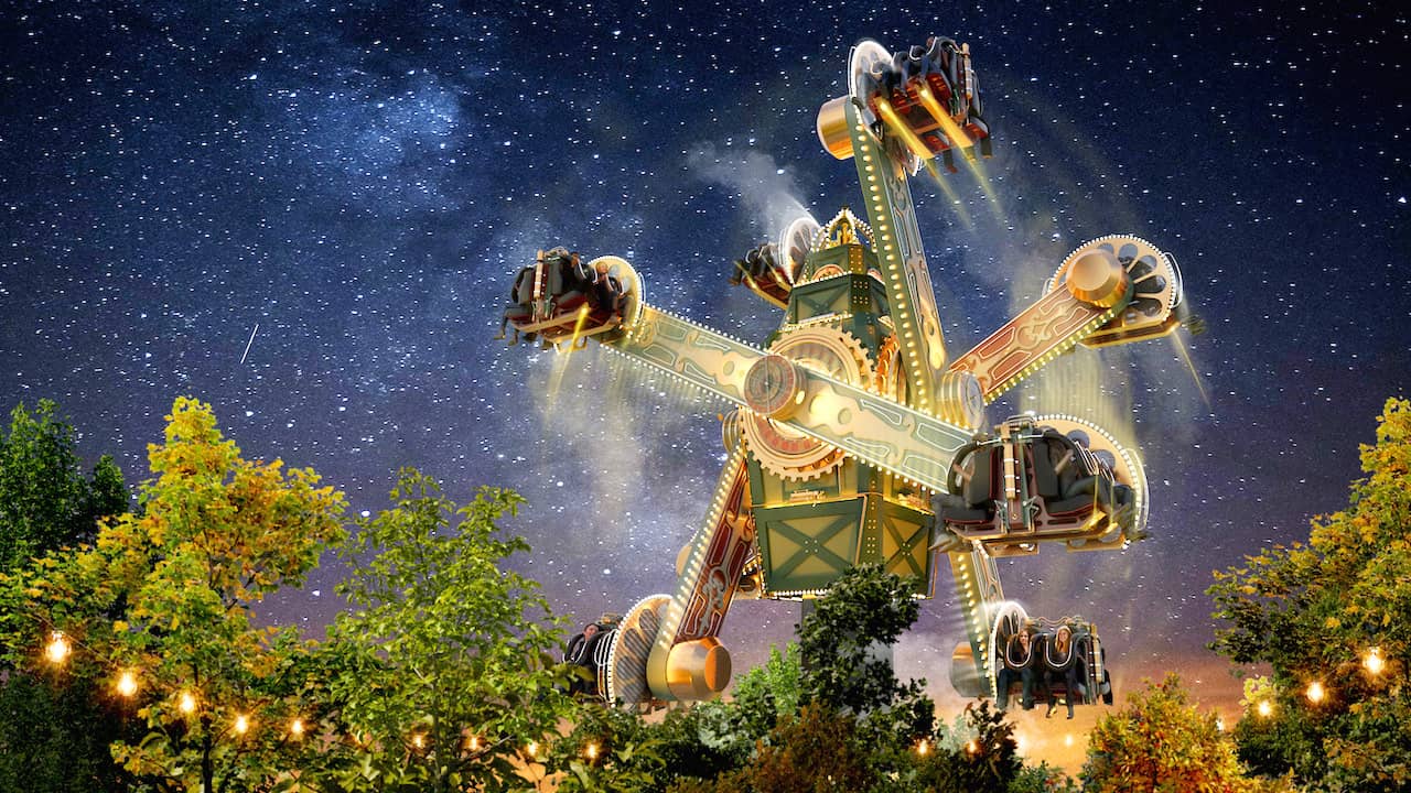 The first phase of Luna Park will open April 23, 2022 and feature two family rides. Tempus will be a Zamperla Nebulaz ride, with four rotating axes. You can see the Zamperla Nebulaz in action here, on my Instagram post from the 2019 IAAPA Expo.