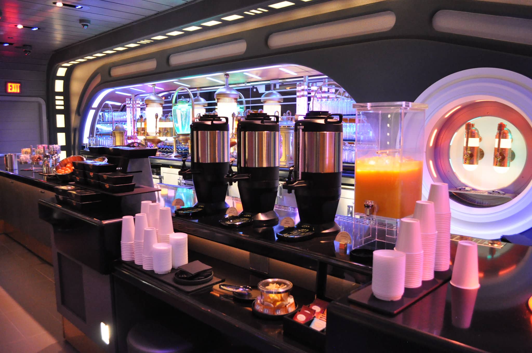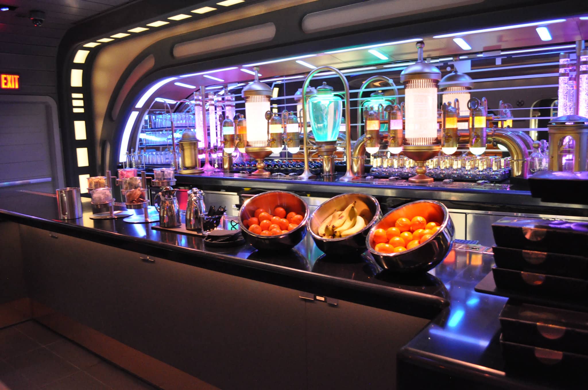 Breakfast and lunch onboard the Halcyon are served in a pre-plated buffet style with open seating in the Crown of Corellia Dining Room. Guests can claim a table and make their way to the back of the dining room where food and drinks are available in a self-serve area. The variety of food choices that are available should satisfy all tastes and dietary needs/restrictions. Breakfast and lunch items are served on square or rectangular dishes that conveniently fit into slots in the cleverly designed trays, complete with the Chandrilla Star Lines logo. For all meals, soda, juice, coffee, and tea, along with both blue and green milk are included. However, mixed drinks (including specialty non-alcoholic drinks), beer, and wine are an additional charge. We were given two drink vouchers for each of us (six total vouchers) as part of the media voyage, which could be used during any of our meals or in the Sublight Lounge.