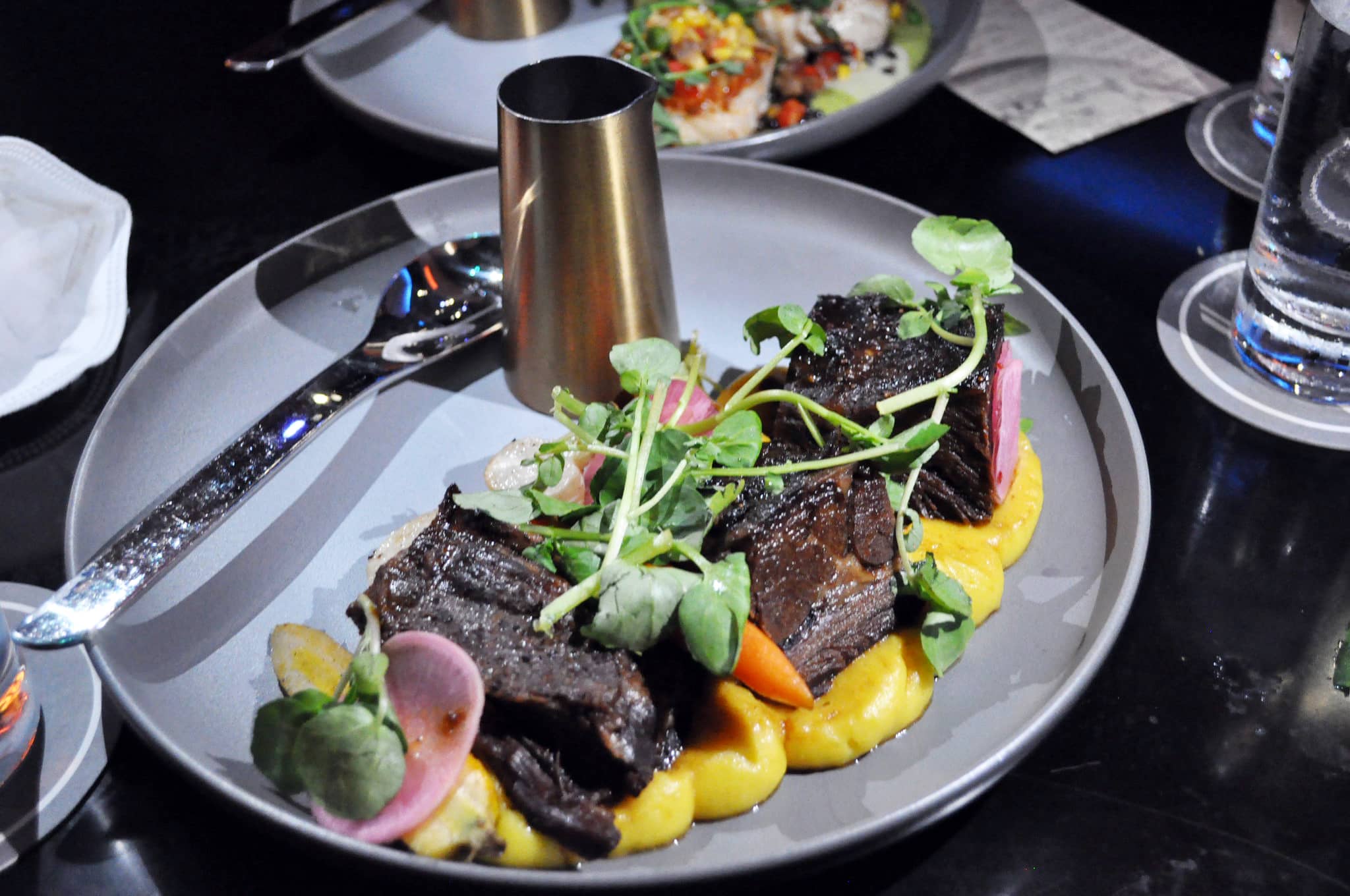 Entrée 1 – Braised Bantha Beef Short Ribs with Rich Fig Fruit Demi-glace, Tuber-turmeric Puree, and Nightshade Flora
