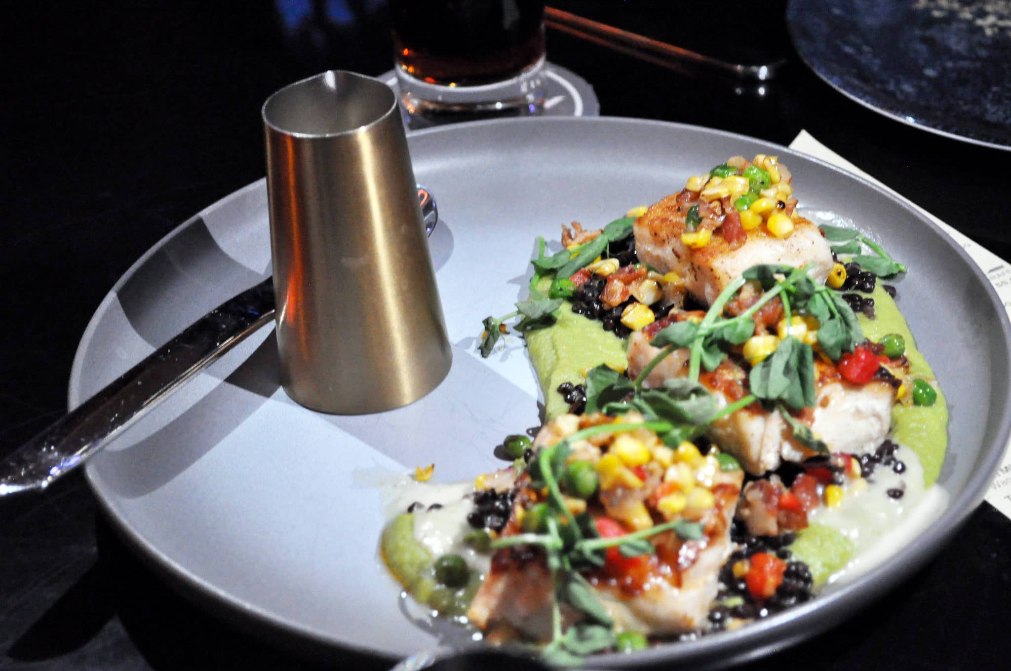 Entrée 2 – Seared Kashyyyk Whitefish with Greenpod Puree, Jekka Seed, Cornseed Relish, and Yellowfruit Buttercream