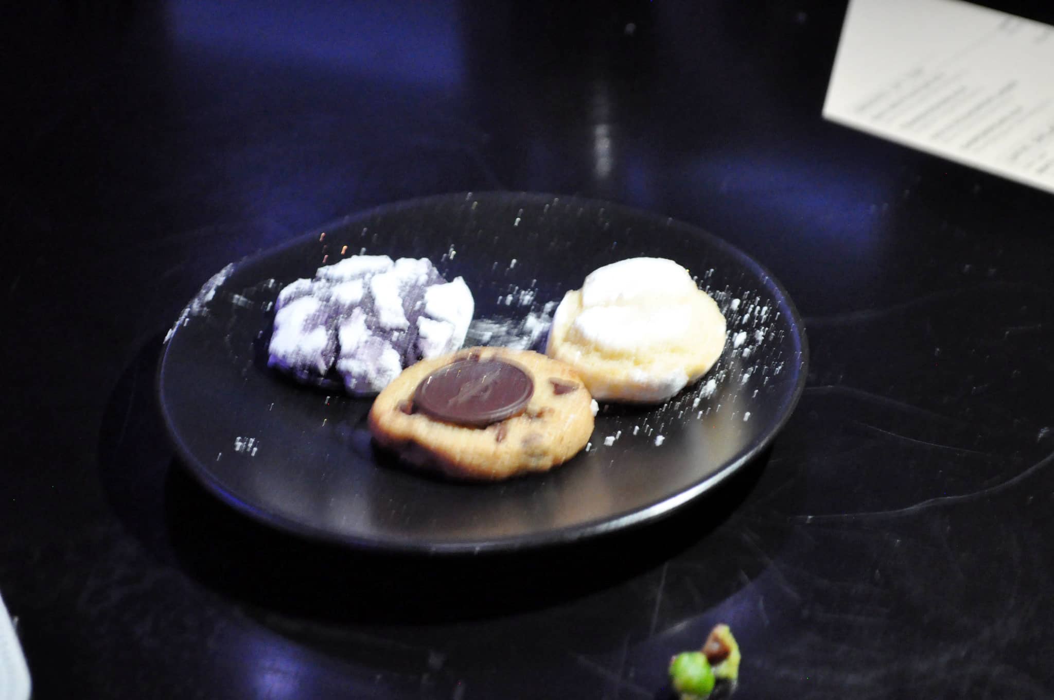Like Day 1’s dessert, we were served an additional plate of desserts for our table. Today we received 3 different cookies, chocolate chip, lemon curd, and Jogan fruit. These 1-bite delights were a nice surprise, but it was hard for us to decide which of us got which cookie.