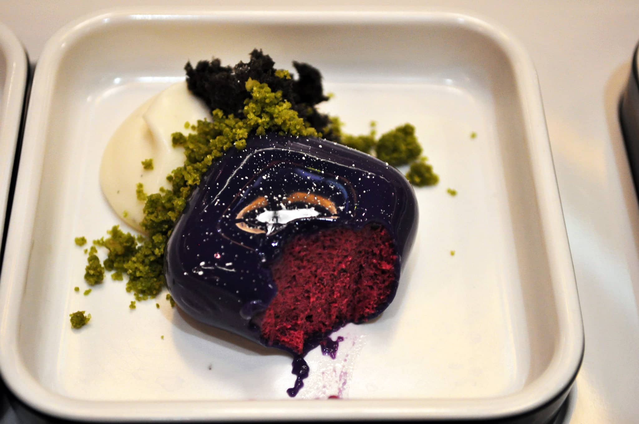 This was visually one of the most interesting lunch options available. The sparkly purple exterior of the dessert looks like a psychedelic star field and conceals a luscious reddish-purple mousse. The green and black dust alongside the white whipped cream create additional visual intrigue as well as contrasting textures to the gooey gel.