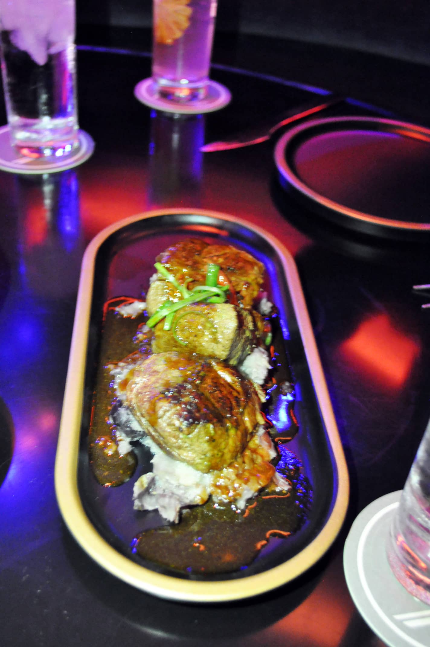 Eewww - blue shrimp! The look of this dish is certainly otherworldly, and a showstopper when presented on a special platter that creates a dry ice fog over the shrimp. For as bizarre as this massive shrimp appear, they taste just like earth ones. The dollops of cocktail sauce were thick, but not sticky enough to actually act as a dip. However, the cocktail sauce was quite tangy with a bit of spice. For us, the seaweed salad and marinated mushrooms added an extra layer of depth to a dish that could have been seen as a standard shrimp cocktail with some visual appeal.