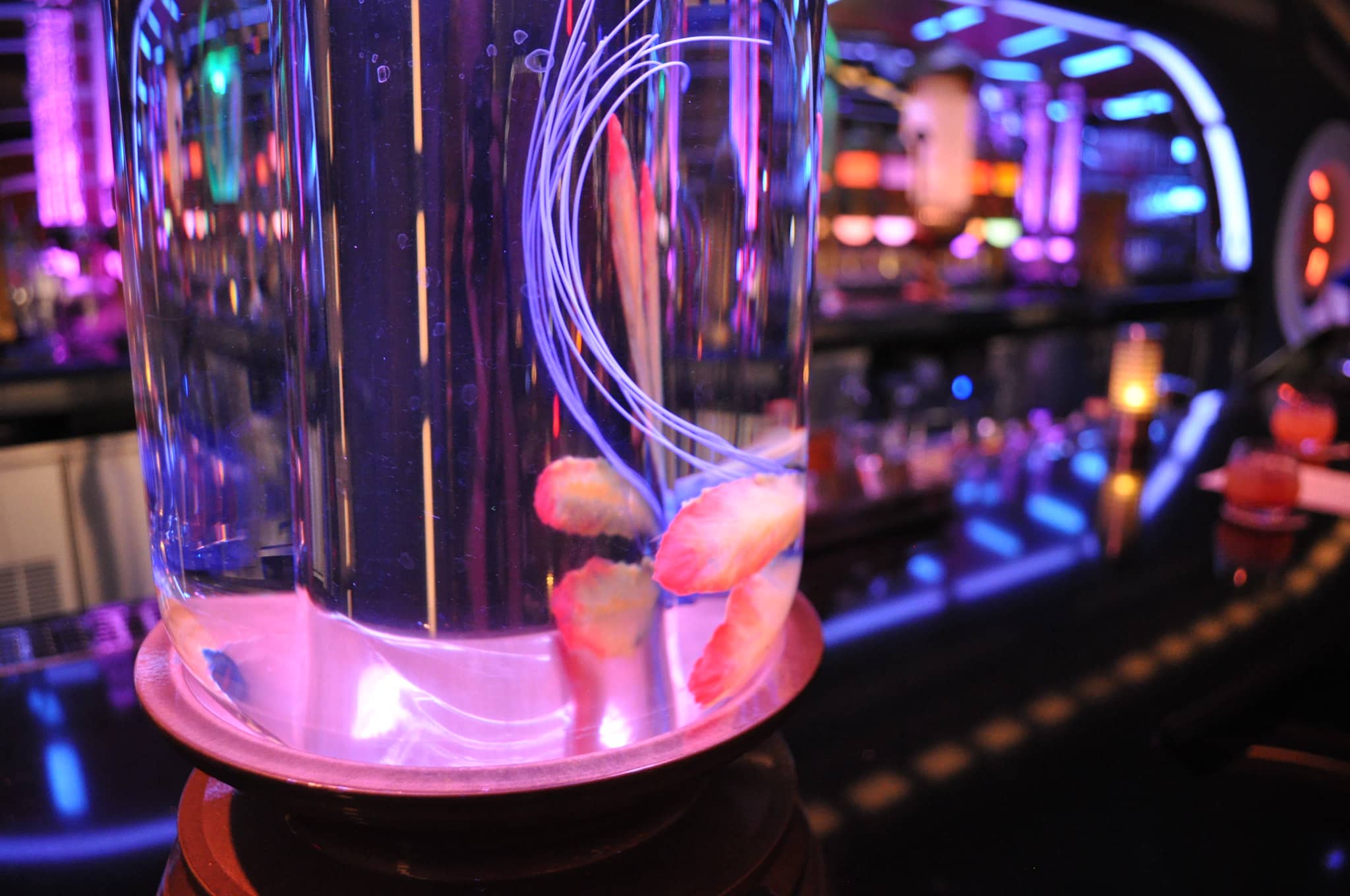 In fact, animatronics are almost completely absent from the Galactic Starcruiser. While I think having an animatronic perform during dinner a la Chuck E. Cheese would have been corny, I think there were plenty of other places where animatronics could have been used around the ship. I guess you could categorize SK-620 as an animatronic, and D3-O9 acts somewhat like an animatronic actor on the screen in your cabin, but there aren’t really any other applications of Disney’s patented storytelling tool. There are a couple of fish-like creatures swimming in jars at the bar of the Sublight Lounge, but those are more atmospheric than anything else. This is definitely a character-driven experience, but I feel that audio-animatronics could have been put to use here.