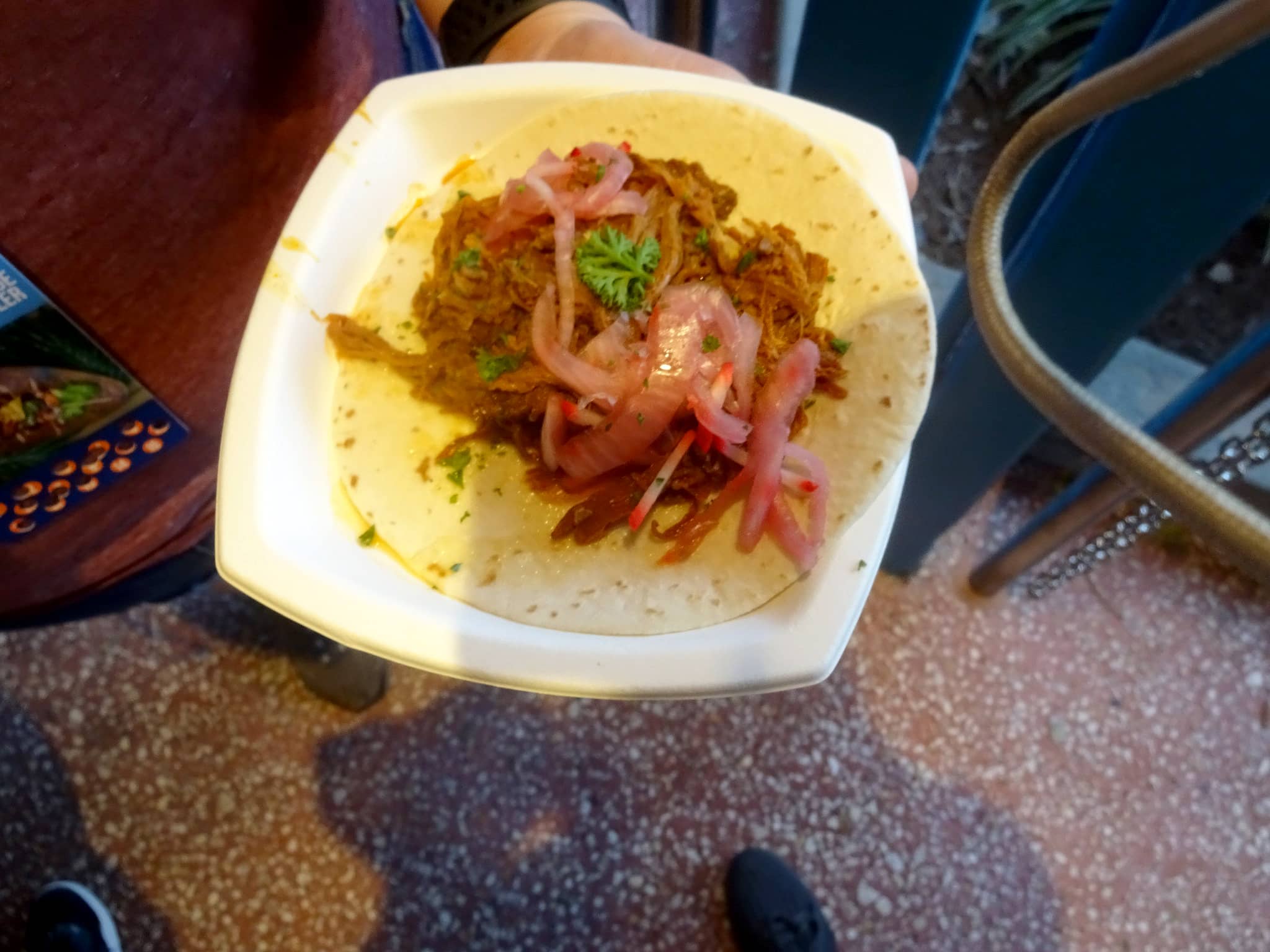The next kiosk was the German Market, and our plan was to get either the Pretzel Bratwurst or Heritage Park Schnitzel Slider. However, both dishes were temporarily unavailable with no indication as to when they could be ordered. We ended up moving on to the Mexican Market, where we sampled two different items.