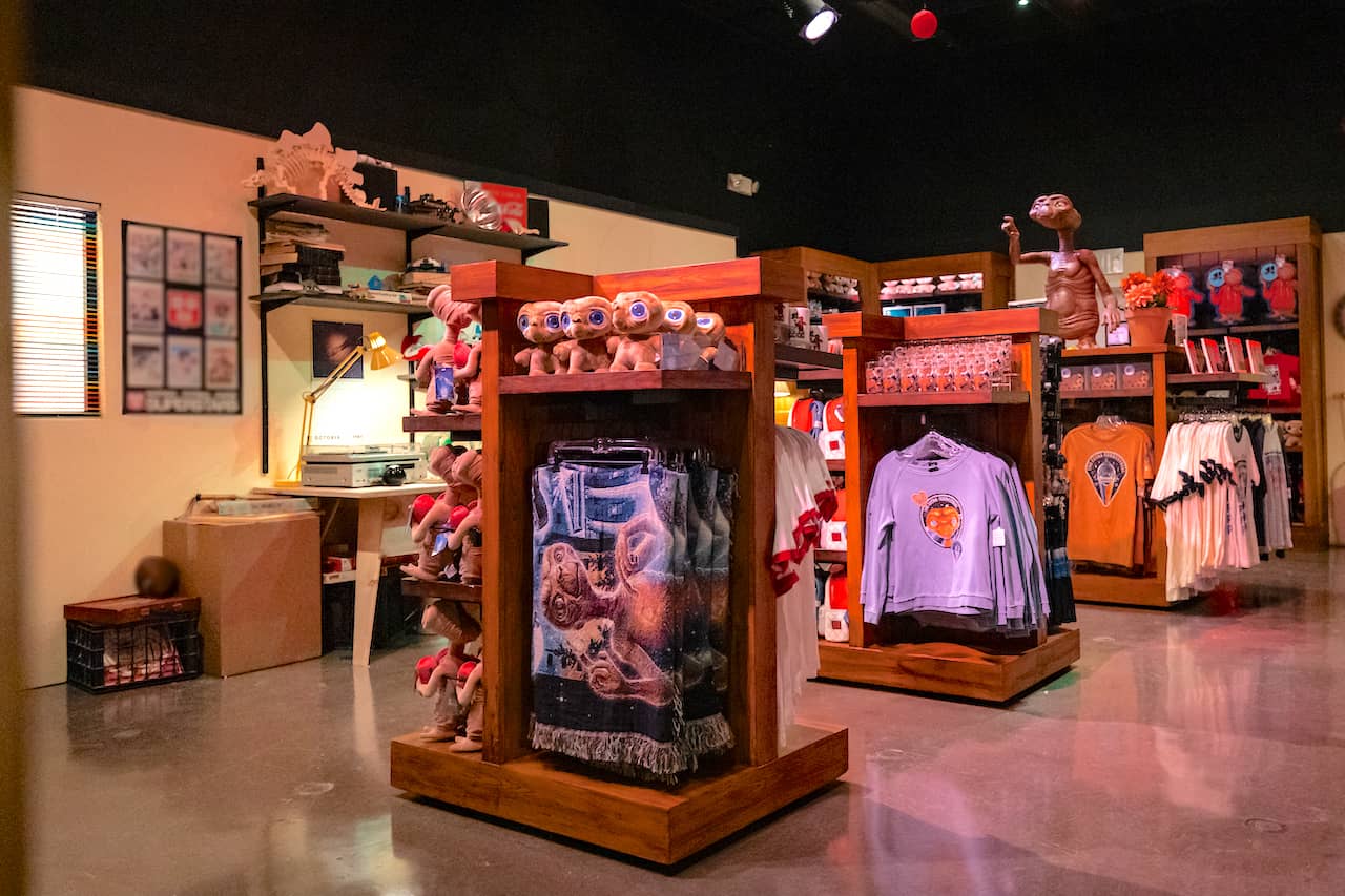 The E.T. room is fashioned as Elliott's bedroom and offers a wide range of E.T. merchandise, from plush to the iconic red hoodie. (E.T. is the only one of the three films here whose ride remains open at Universal Studios Florida.)