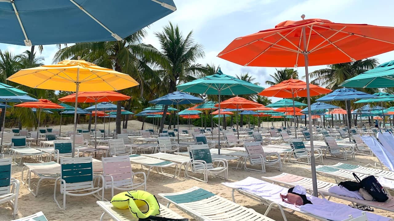 Cast members hand you a beach towel as you step off the ship, and thousands of beach chairs and recliners await you on the sand.