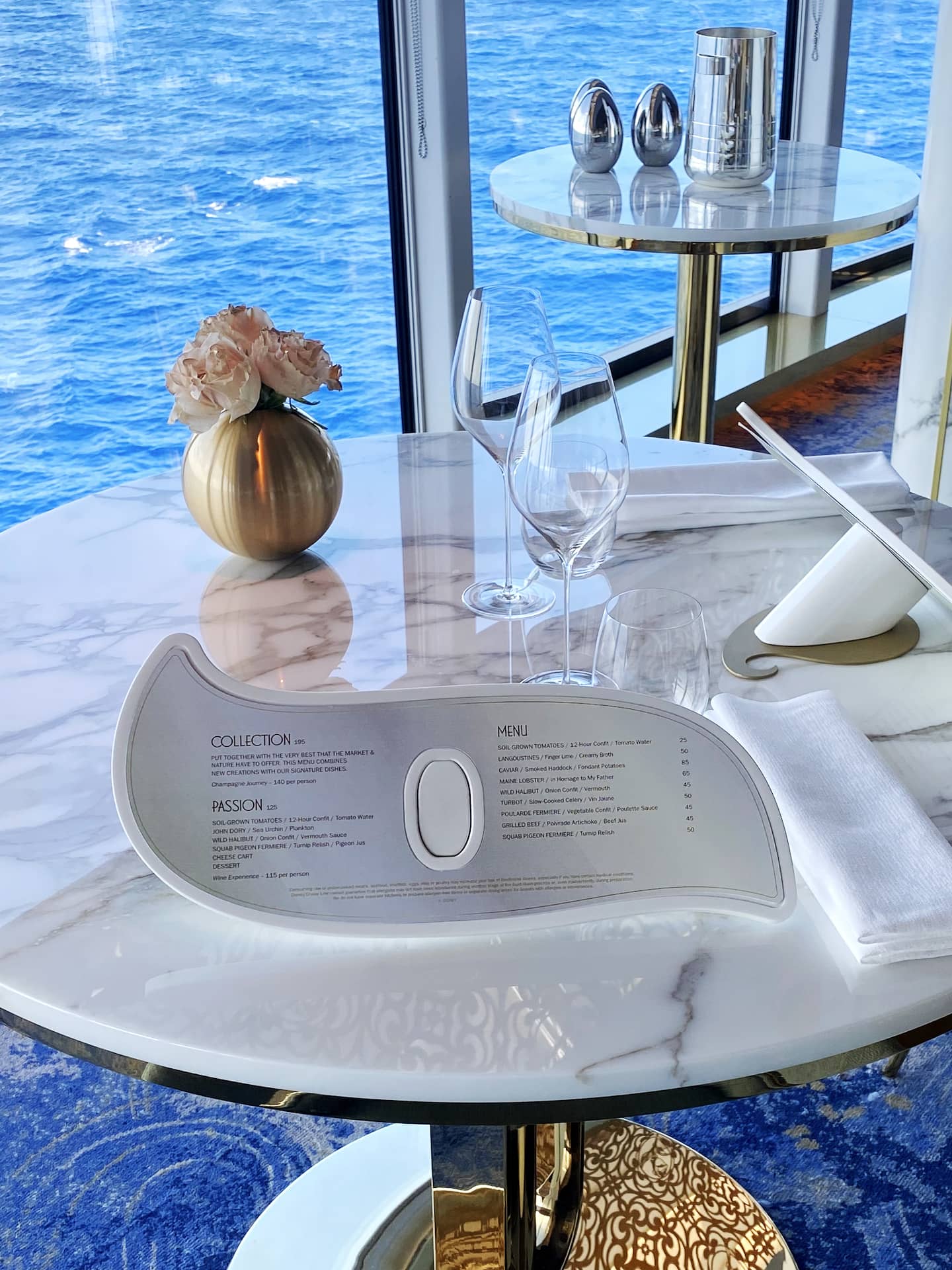 The Wish's two upcharge adult dining experiences were not available for meal service during the media preview, but we did get to take a look inside both. On the Wish, the Disney Cruise Line's Palo has been reimagined as Palo Steakhouse. The focus remains on Italian cuisine, but there is a $45 prix fixe menu available as well as a selection of USDA Prime and Wagyu cuts, ranging from $20-62. Here is the menu: