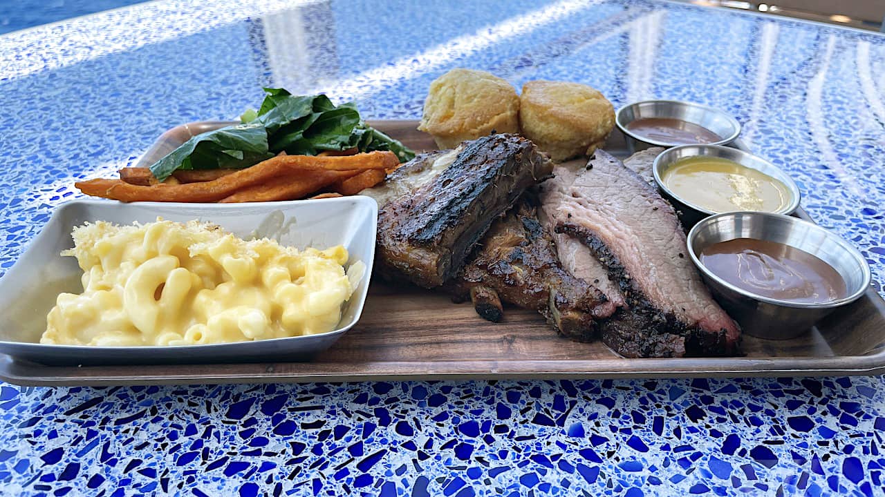 The barbecue seemed redundant after our lunch at Cookie's on Castaway Cay the day before, but we went for it anyway. Brian got an excellent plate here, with flavorful brisket showing a clear smoke ring. Yet the plate I got had almost flavorless brisket, despite being a fattier cut.
