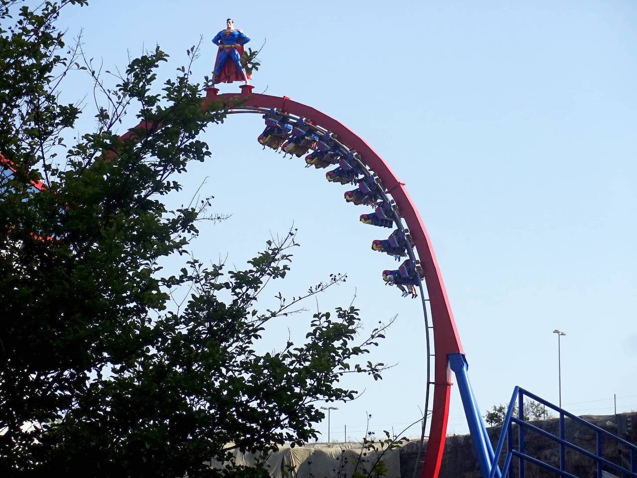 The other coaster located in DC Universe is Batman The Ride. No, this is not the B&M Invert you’d find with this name at many Six Flags parks around the country, it’s the first-ever S&S 4D Free Spin coaster. Six Flags has installed a few of these same coasters around the country, including The Joker we rode a few days earlier at SFoT. However, this one has a detailed indoor queue area before guests reach the Batmobile before the line split that sends guests to each side of the coaster’s loading platform. Again, the theming is not on the same level of Disney or Universal, but it’s far beyond what most guests would expect in any other Six Flags park and makes an otherwise standard coaster feel like a better attraction than other clones around the country.