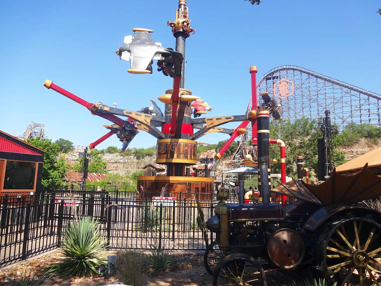 The theming around Iron Rattler and Roadrunner Express is decidedly Western, but with the addition of Dr. Diabolical and the next ride we came upon, Daredevil Dive Flying Machines, the park is introducing more Steampunk elements into the area (a la Wild Wild West) and has rebranded it as Crackaxle Canyon Screampunk District. Daredevil Dive Flying Machines debuted for the 2021 season and is a Zamperla Super Air Race attraction. Until we had ridden Super Air Race at Luna Park a few weeks earlier, we had never ridden an attraction quite like this. It’s a peculiar looking ride where guests are loaded into four-seat planes (two rows of two seats) that lift, spin, and flip. You can get dizzy just watching this ride operate, but on board it is quite thrilling, especially on SFFT’s version that includes fire effects and a custom soundtrack. As with many of the big attractions at SFFT, the queue is well themed, providing guests a bit of backstory on the ride while you’re waiting.